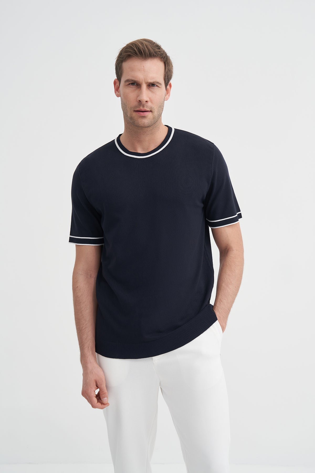 Bisiklet Yaka Regular Fit Çizgili Triko Tişört 3013
