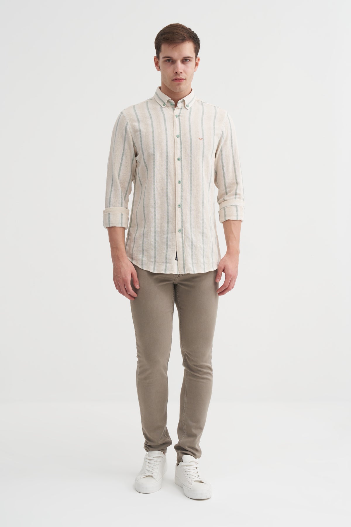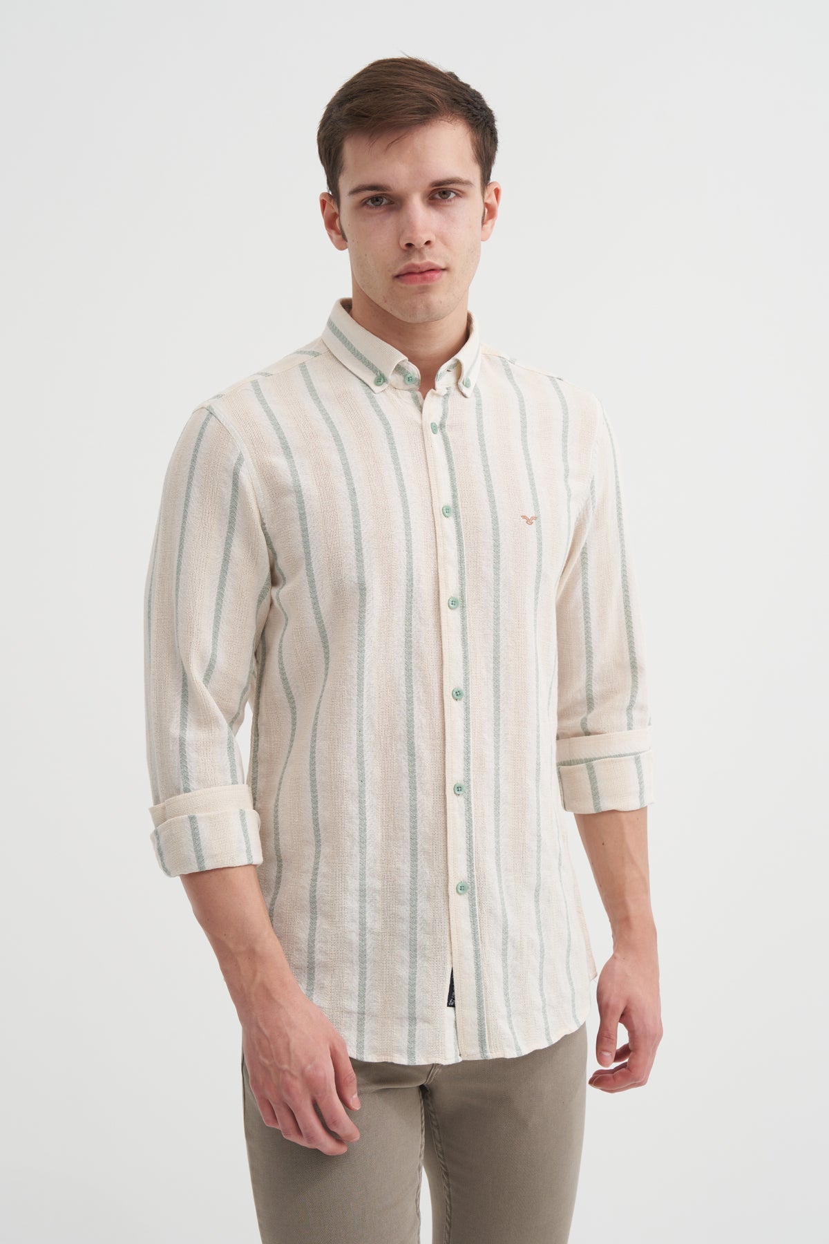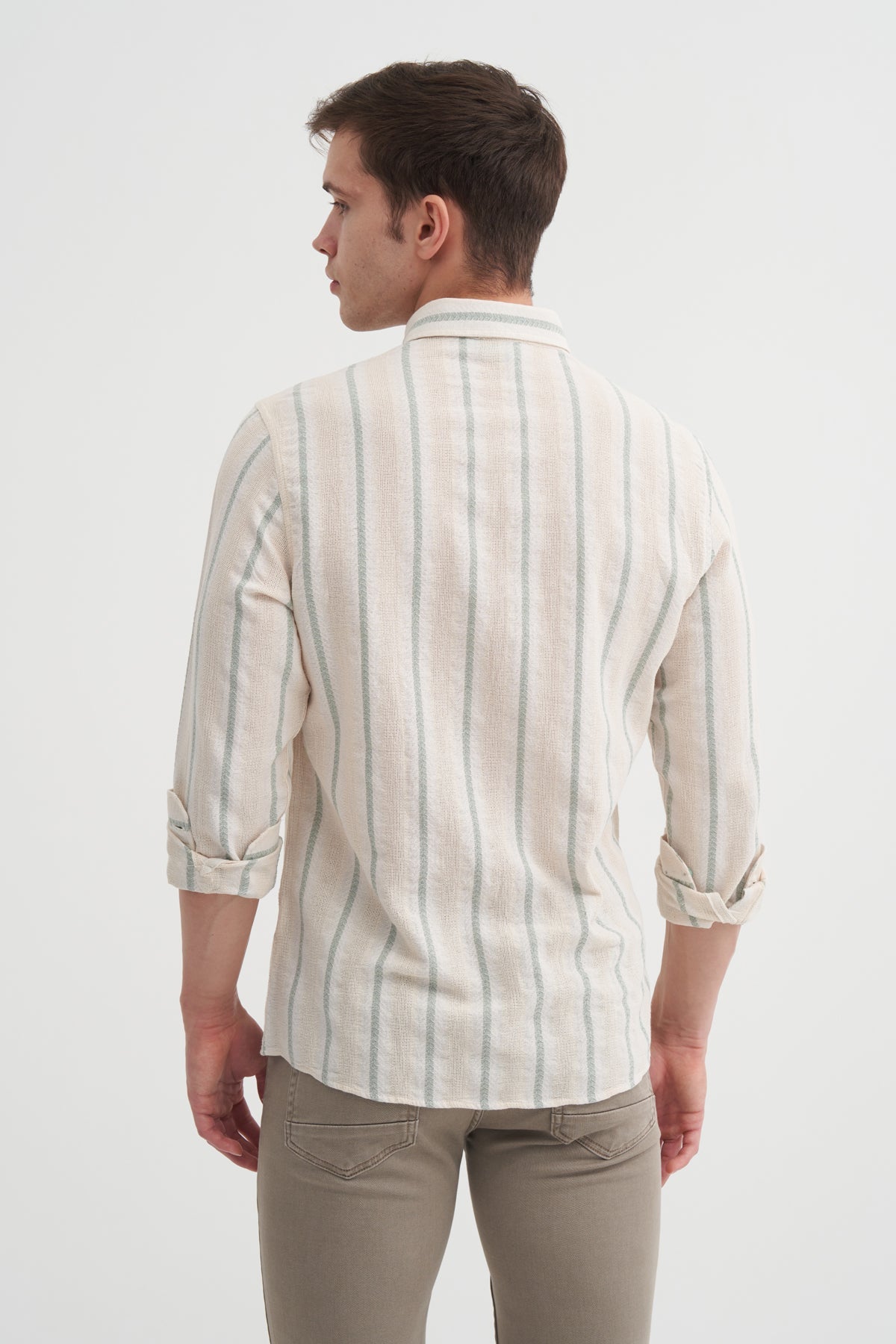 Regular Fit Dokuma Pamuklu Çizgi Desenli Uzun Kol Gömlek 2035
