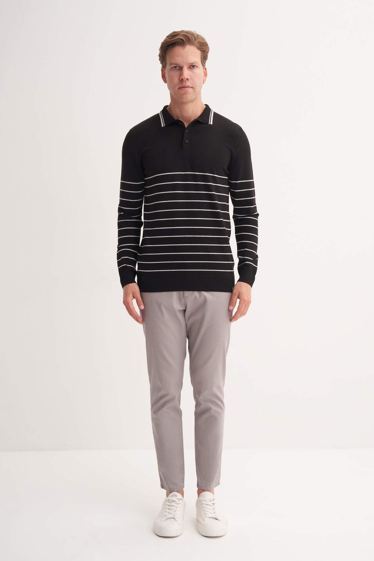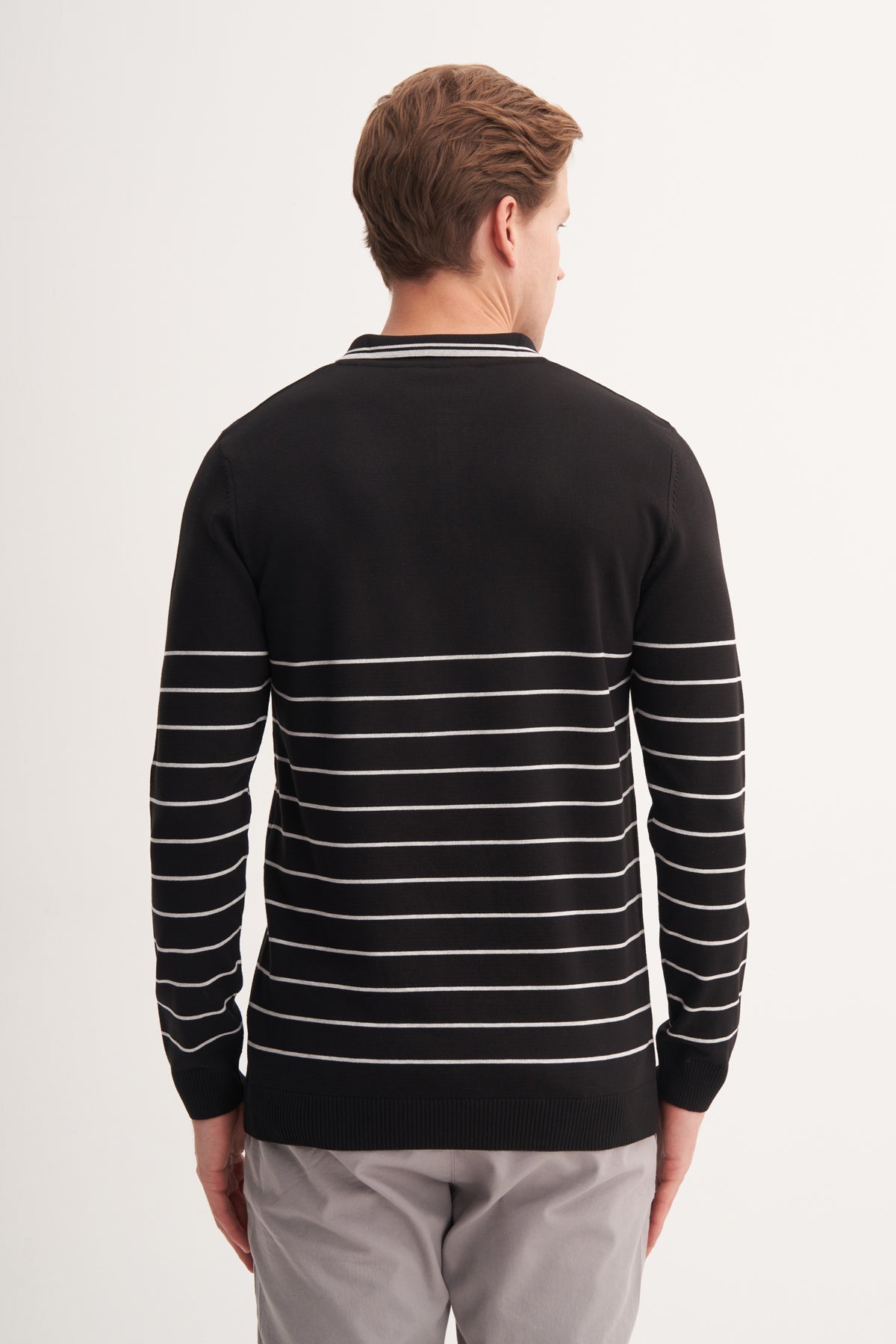 Slim Fit Viskon Dokulu Basic Çizgi Detaylı Polo Yaka Kazak