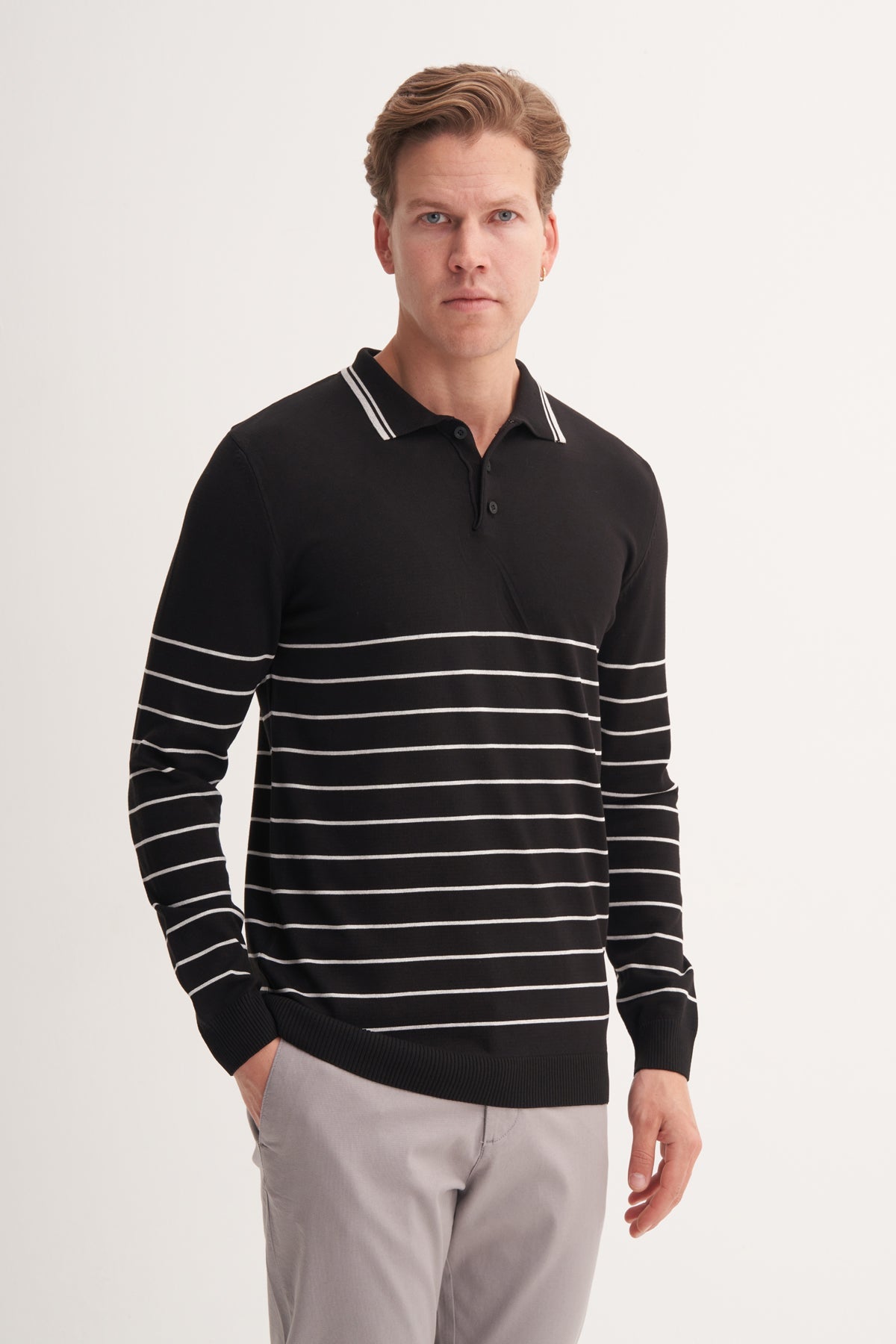 Akışkan ve rahat viskon dokusuyla dayanıklı yapılı bu çizgi detaylı polo yaka kazak, basic koleksiyonun zamansız parçalarından biridir. Slim fit kesimi ile modern bir tarz yakalayın.