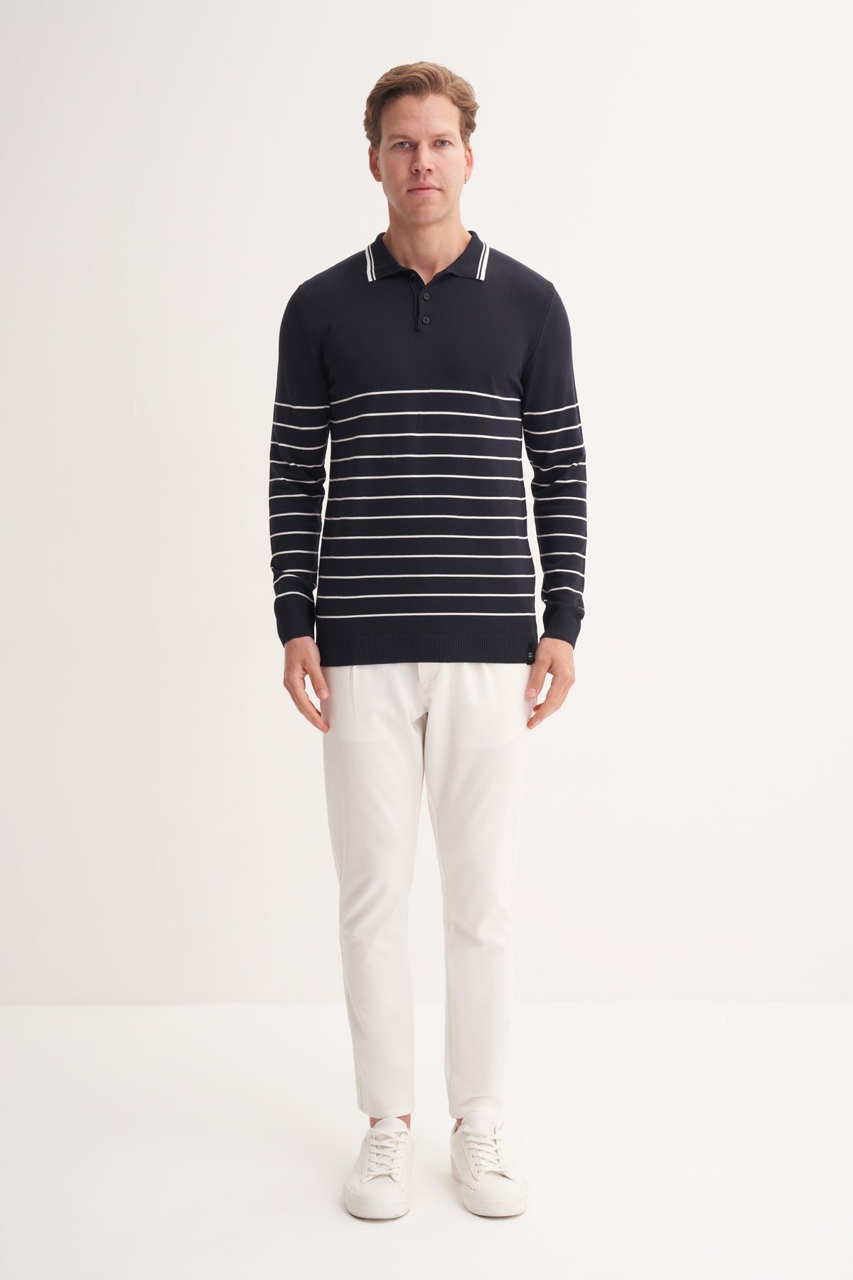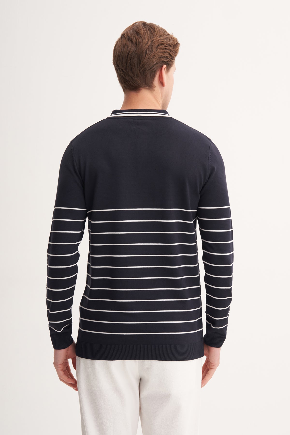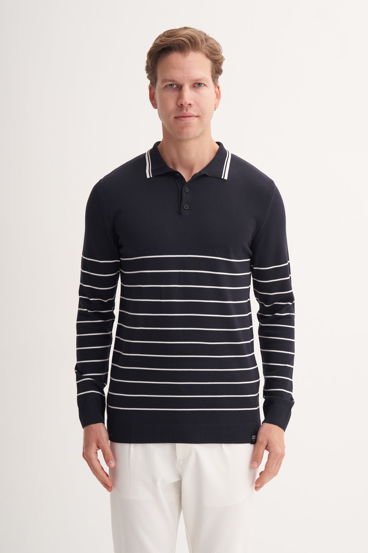 Slim Fit Viskon Dokulu Basic Çizgi Detaylı Polo Yaka Kazak