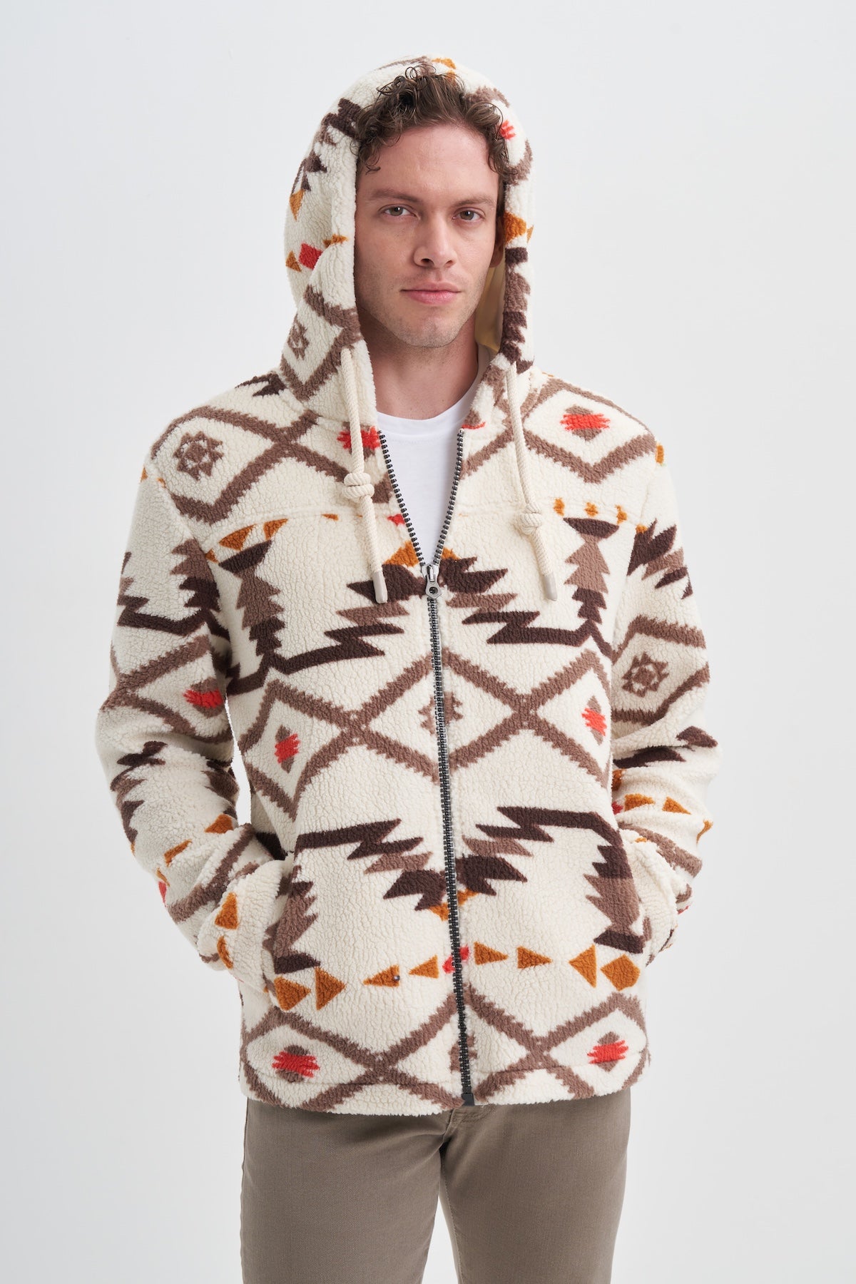 Vintage Desenli Kürklü Regular Fit Kapüşonlu Sweat Hırka